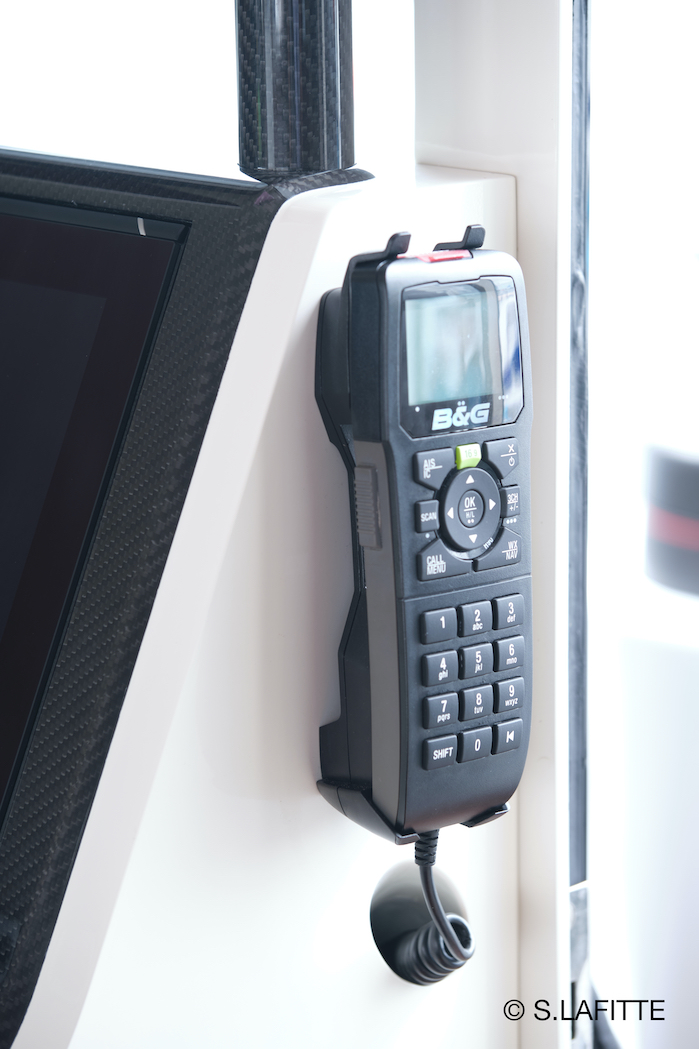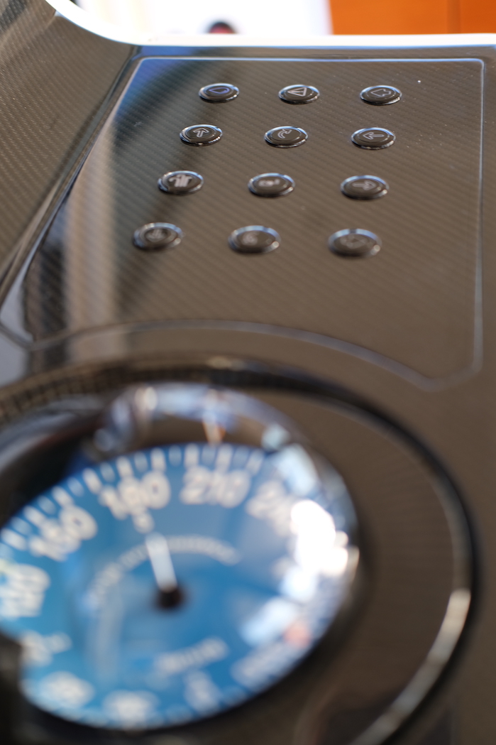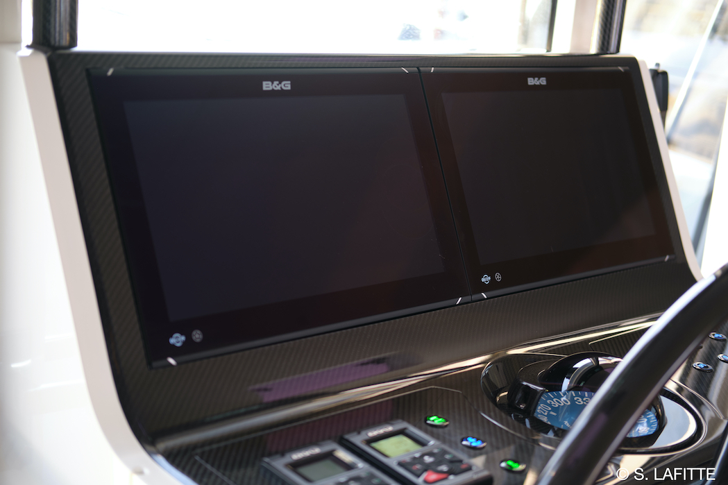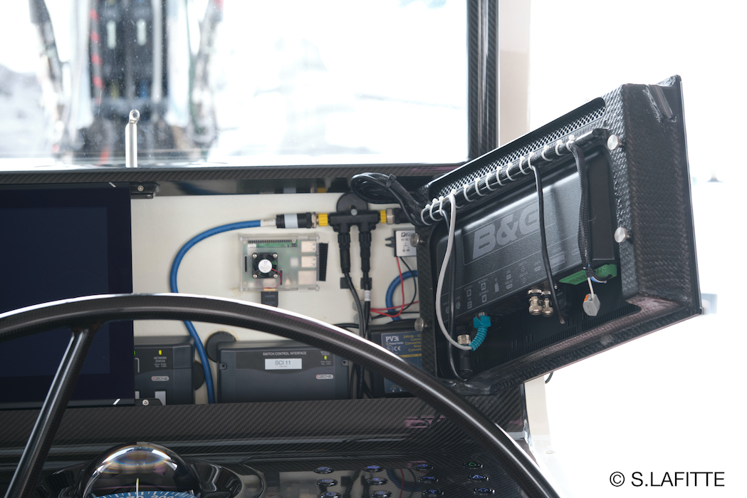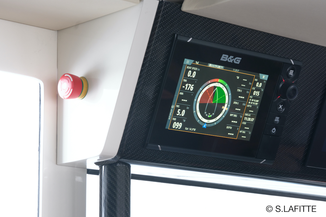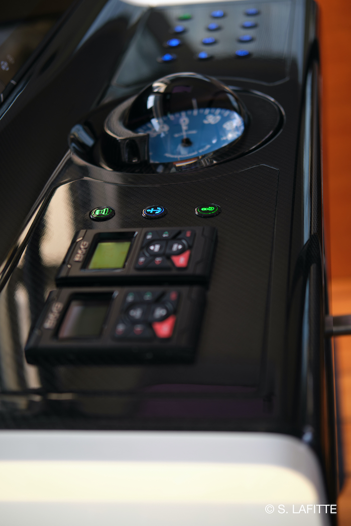 The helm-station has been designed by our favorite Designer Christophe and our Captain Sebastien with esthetics, ergonomics and access to electronics in mind. It was build a “master boatbuilder” and “carbon artist” in England. We love his sense of details. And the helm station is also full of hidden genius design features.