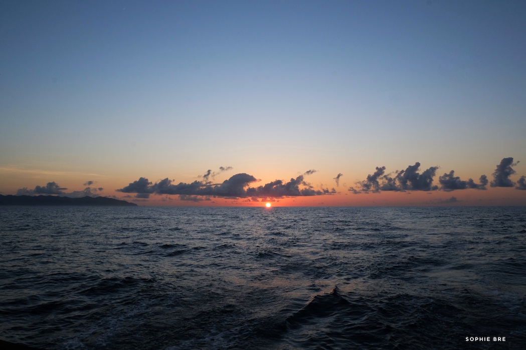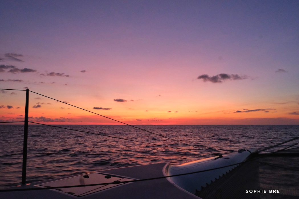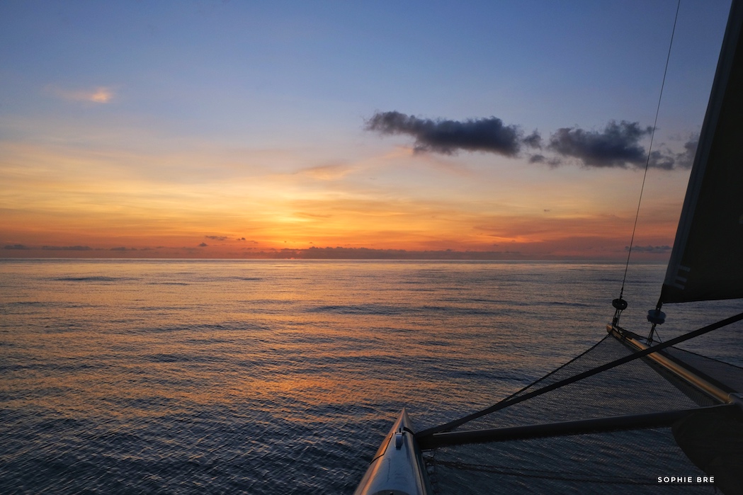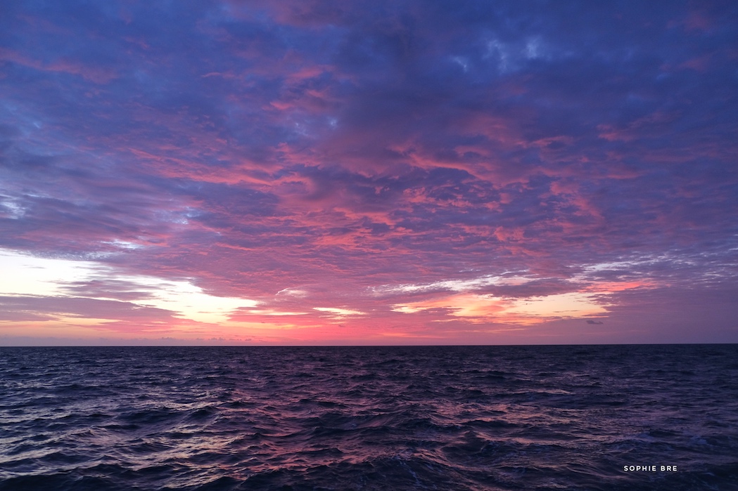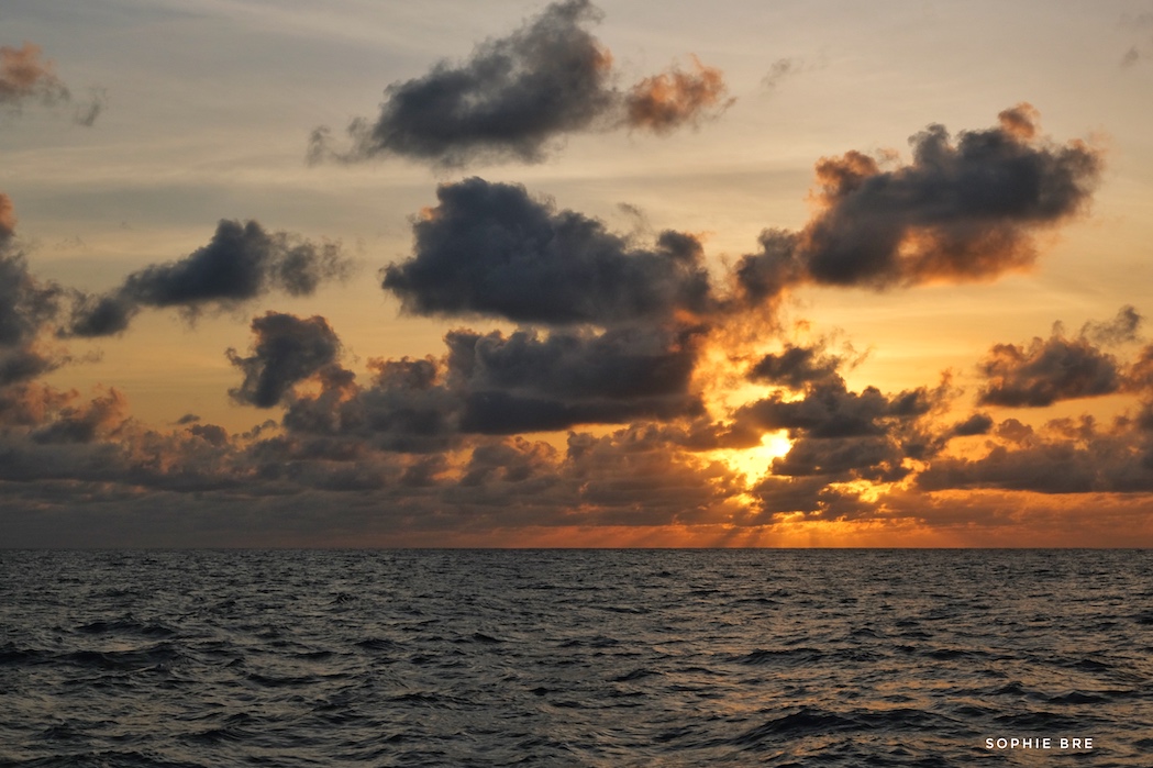One more thing to mention: it was very very hot as there was also so little wind. The high temperatures made taking naps during the day almost impossible. Which probably also contributes to the fact the trip felt so long, even if it was only 11 days for 2200 nm [yes, our zigzagging to keep the wind always add more miles to the straight line and … also make it longer]. Luckily there are sometime dolphins passing by to entertain us. And the sunsets & sunrises provided amazing colors.