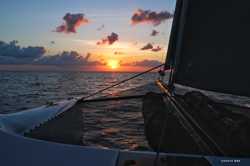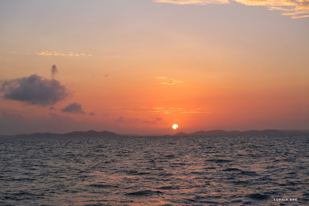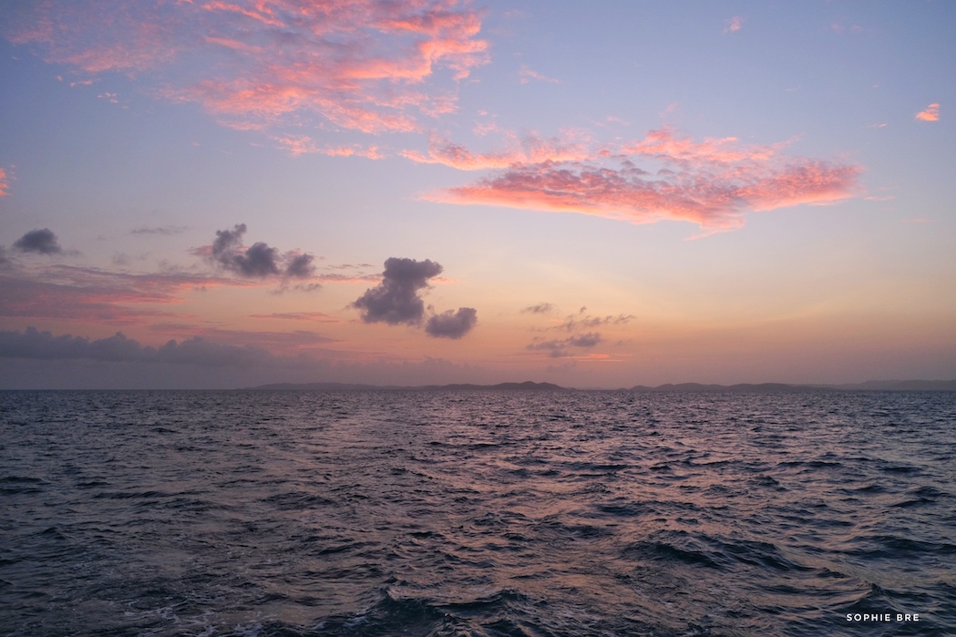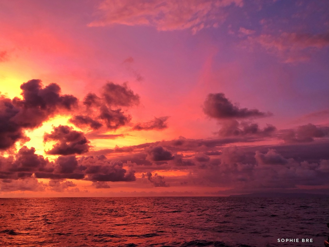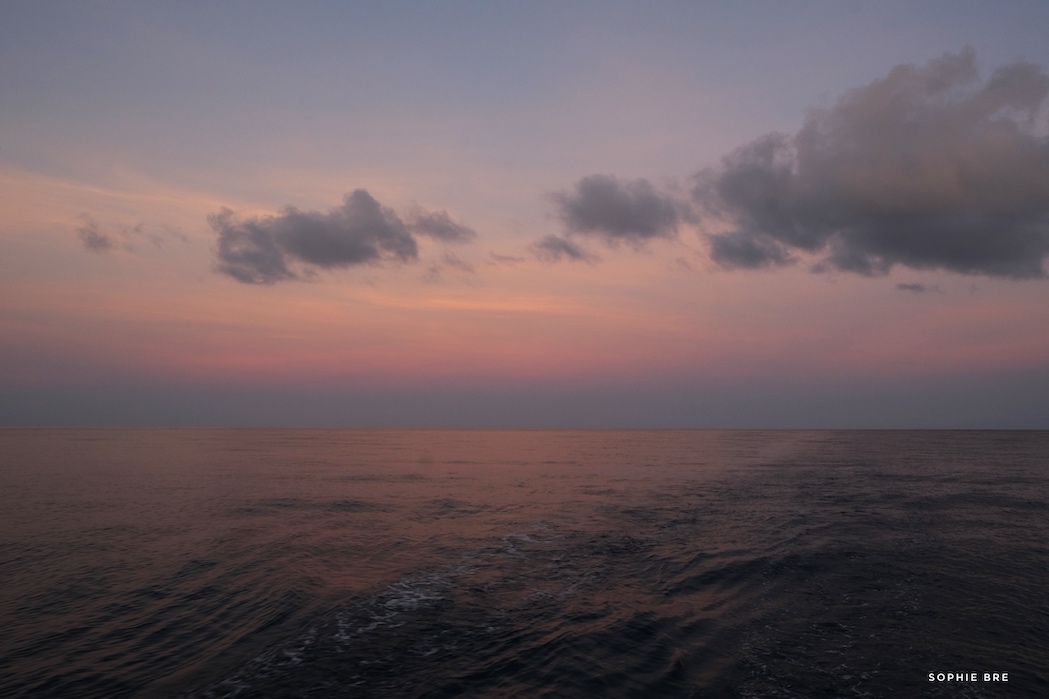 One more thing to mention: it was very very hot as there was also so little wind. The high temperatures made taking naps during the day almost impossible. Which probably also contributes to the fact the trip felt so long, even if it was only 11 days for 2200 nm [yes, our zigzagging to keep the wind always add more miles to the straight line and … also make it longer]. Luckily there are sometime dolphins passing by to entertain us. And the sunsets & sunrises provided amazing colors.