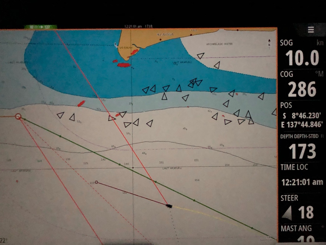 During the trip along side Papua New Guine, Papua and Timor Leste, we followed the sea border between the countries in the North and Australia. There was a bit more wind in the North but also way to many fishing boats. Sailing/jibing along the sea border was the best compromise to get away from fishing traffic.