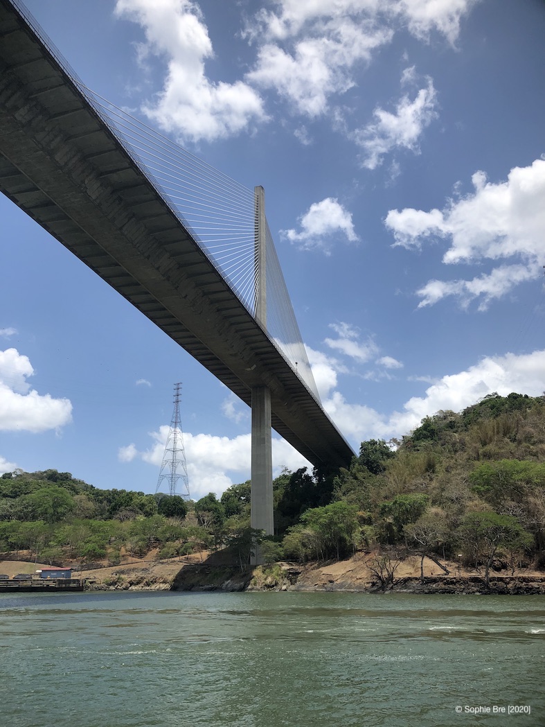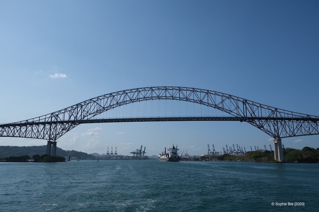 The Panama Canal consists on two sets of locks – Gatun Locks on the Atlantic/Caribbean side and Miraflores Locks on the Pacific side. In the middle is a big lake and some distance to travel. There are also three bridges – one before the first locks, one in the middle and one [Americas Bridge] after the last locks on the Pacific side. [For reference, my whole description is based on a passage from Atlantic to Pacific]