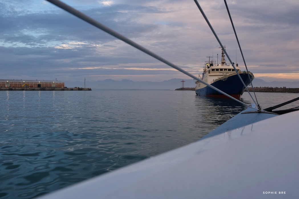 The captain of the fishing trawler was very happy to have us tied up to him instead of an other fishing boat – less traffic through his boat with only the two of us on board and also less weight pulling on his boat. By the way we asked them what they were fishing and the answer was “sardines” in the winter out of Mosselbay and anchovies in the summer in St. Helena Bay on the west coast of South Africa. We shared some of our “French style” Sardine in olive oil cans from Brittany with them to taste as the sardines they are catching are much bigger and end up in round cans with tomato sauce.